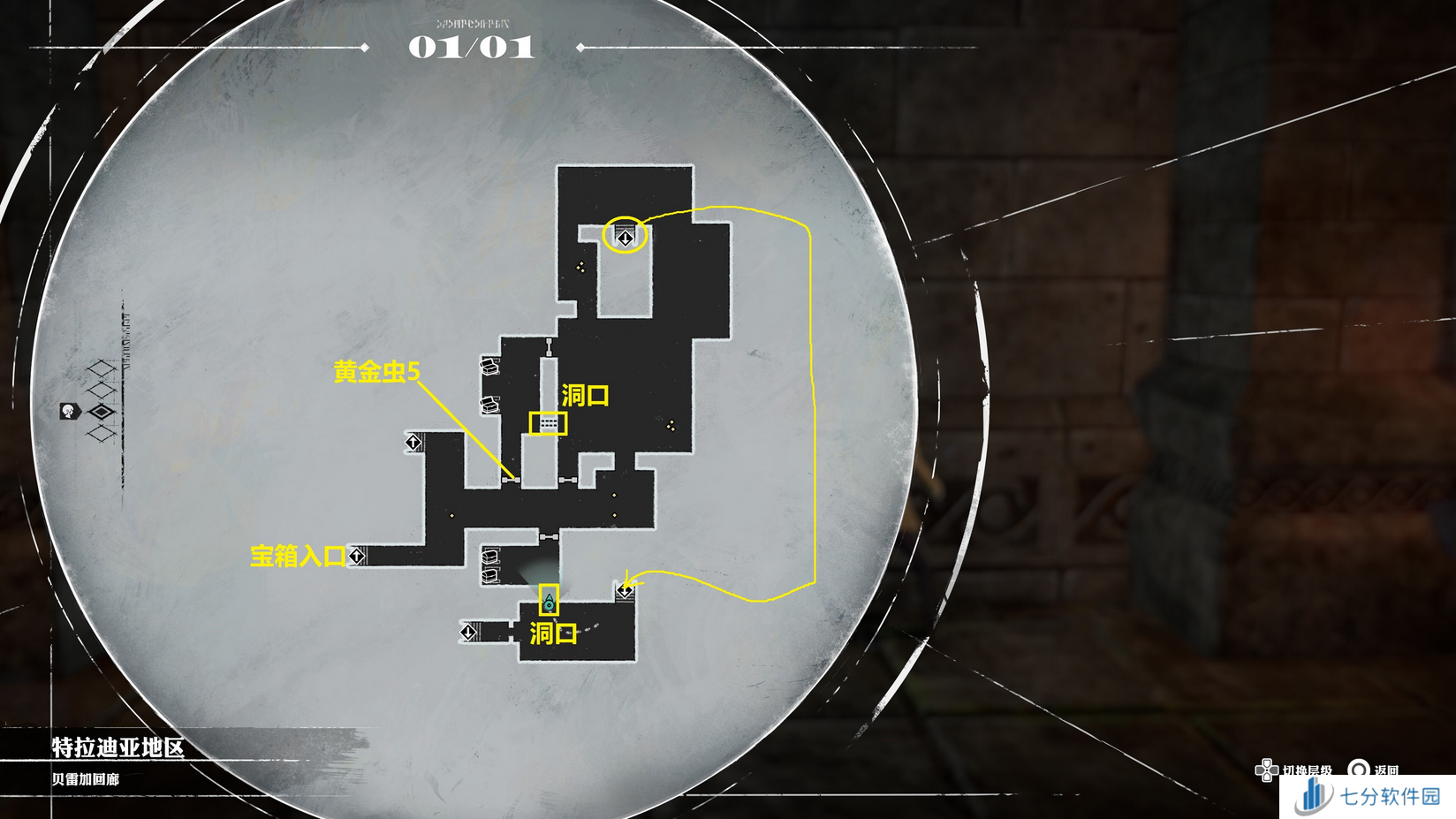 去贝雷加回廊按照上面地图,从地下2层最北边,黄圈处的楼梯下去,直走一个大长廊上去,就来到地下2层南部洞口位置的房间,如上面图,从洞口进入隐藏房间。南部宝箱,里面是屠戮百鬼之枪,北部宝箱,里面是守卫护腿。