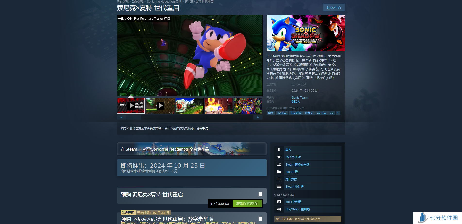 《索尼克×夏特 世代重启》是索尼克系列游戏的最新作,属于是快节奏动作3D平台游戏,而这款游戏的登录平台只有Steam平台,想要玩只需要在这个平台购买下载就可以了,版本没什么区别,