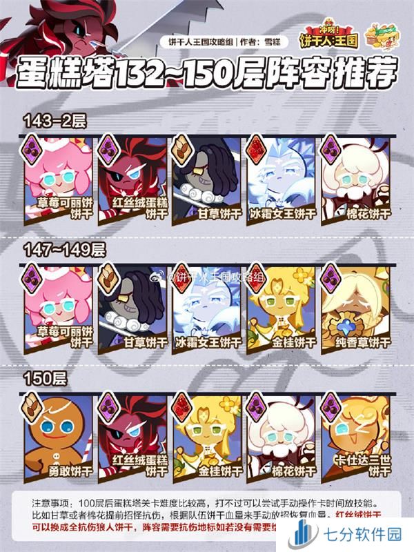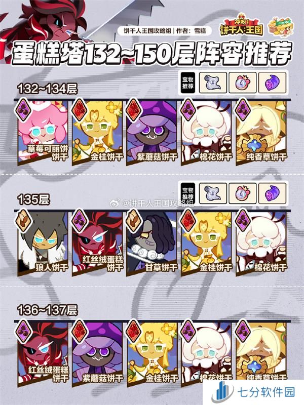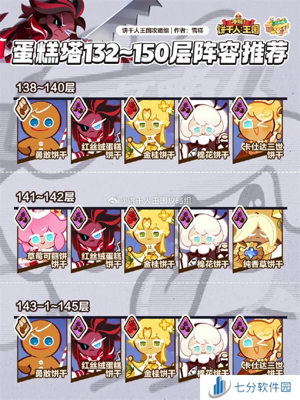 1.冲呀饼干人王国蛋糕塔132-150层阵容如下: