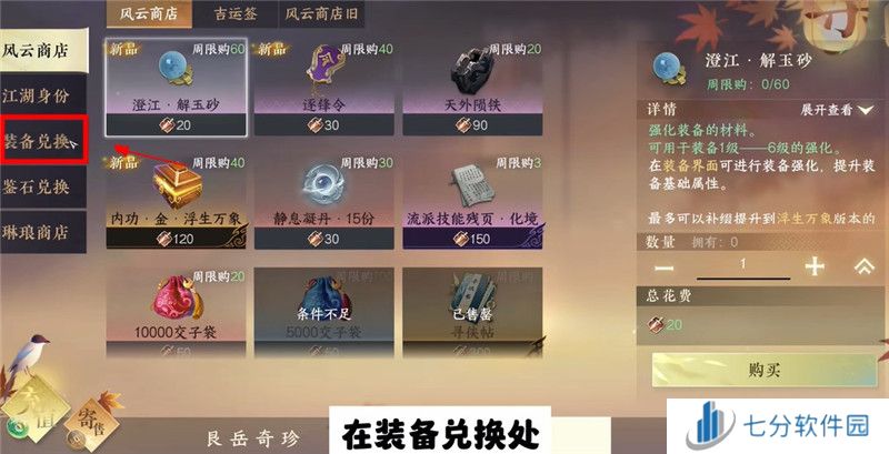 装备兑换方法:1、需要玩家们自己去打开商店,选择装备兑换这个按钮,在装备兑换处直接兑换87装等的紫色装备,直接用4万交子就可以兑换成功。