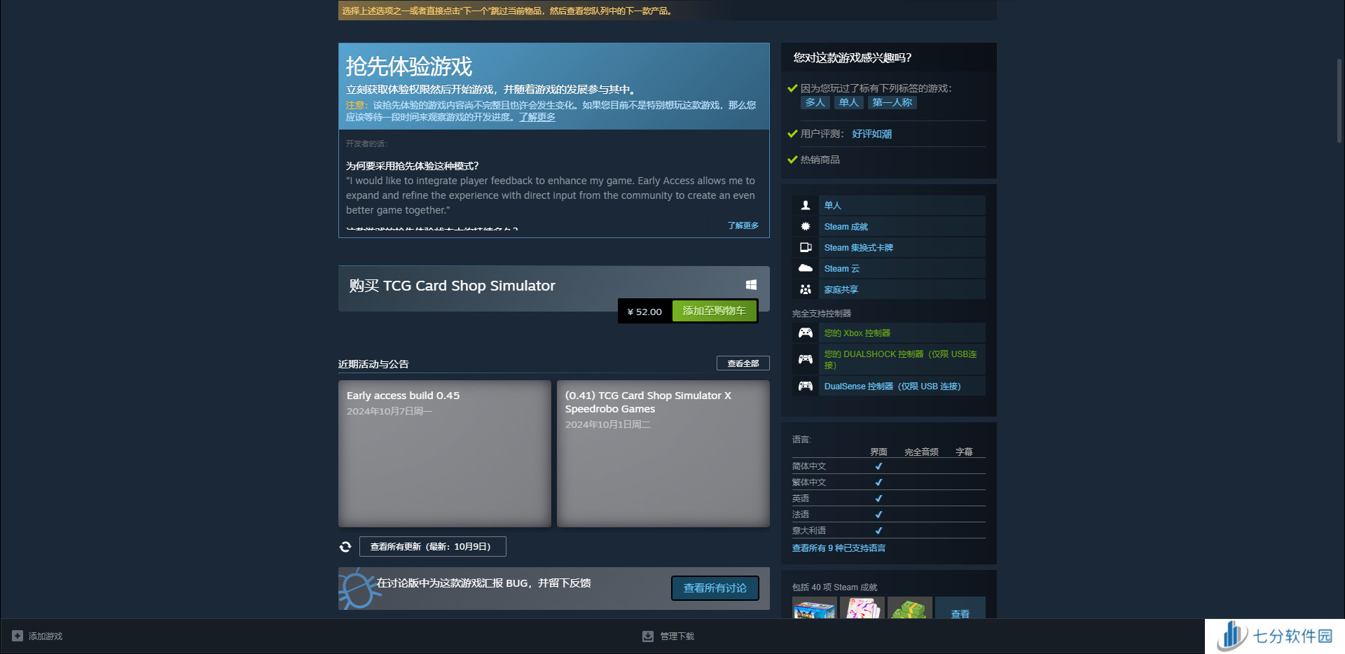 《卡牌店模拟器(TCG Card Shop Simulator)》这款游戏在Steam平台只有标准版,售卖价格就是人民币52元。