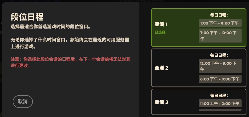 根据自己每天空余时间选择其一即可,注意:选择后下周才可以修改。根据官方的说法,无论你选择哪个时间,你总会进入最近可用(延迟最低)的服务器。