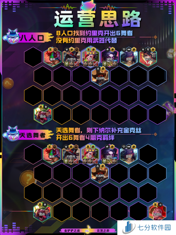 如果有2星约里克,优先约里克当主C,强度会比波比高很多。装备被优先拿朋克转,其他装备随便搭配