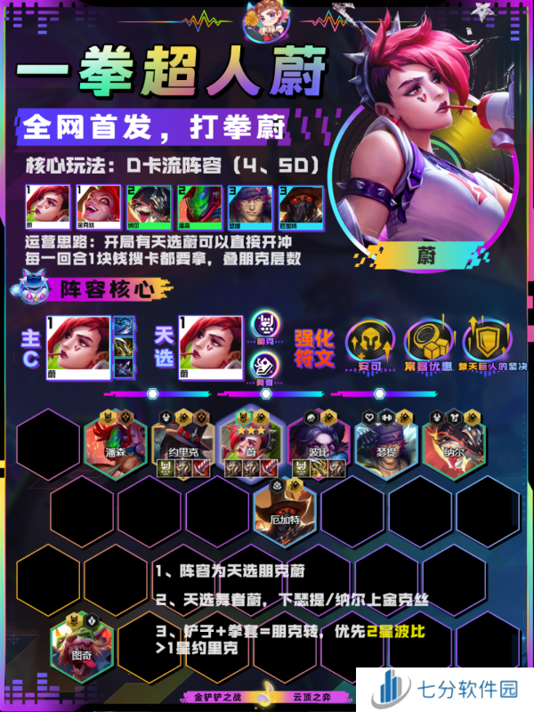 1.金铲铲之战一拳超人蔚阵容组成:蔚、金克丝、潘森、纳尔、瑟提、厄加特、约里克
