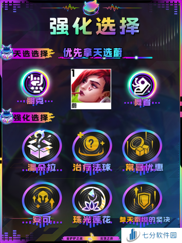 优先拿天选朋克蔚,这样能够保证开出6朋克羁绊,这个是最高的提升。如果是天选舞者蔚,需要有2个朋克转职(2个铲子)要求较高