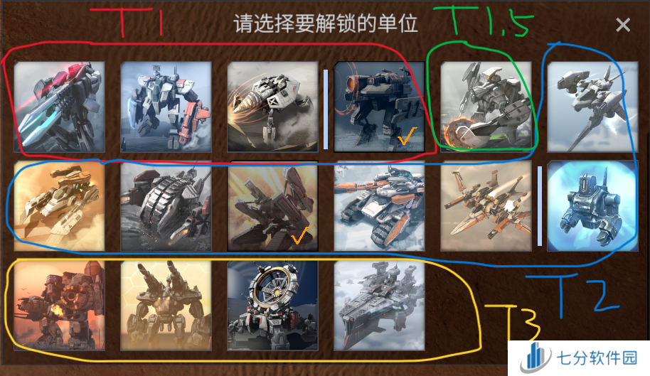 第一回合开始时,双方都有四个初始开局可以选择,但是这个初始开局双方是不一样的。初始开局包含一个专家,两队t2,三队t1,并且解锁对应的单位。(t2是指用50块钱解锁200购买的单位,t1是指0解锁费100购买的单位,t3专指200解锁400购买的巨型单位)同时每个初始专家的血量是不一样的。