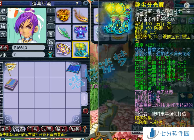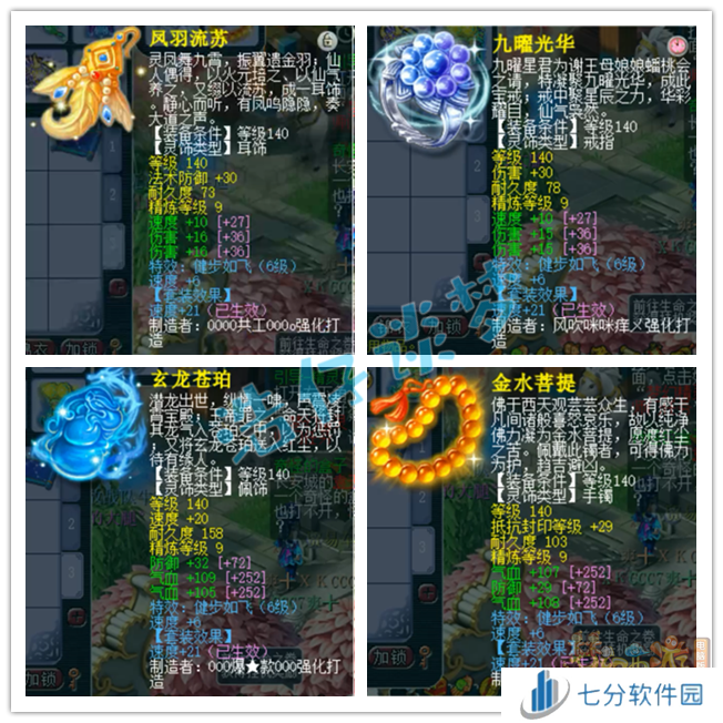 戒指和耳饰性价比较高,下排都是双伤害一速度,佩饰和手镯双气血一防御,全部打了9锻星辉石,特效6级健步如飞。