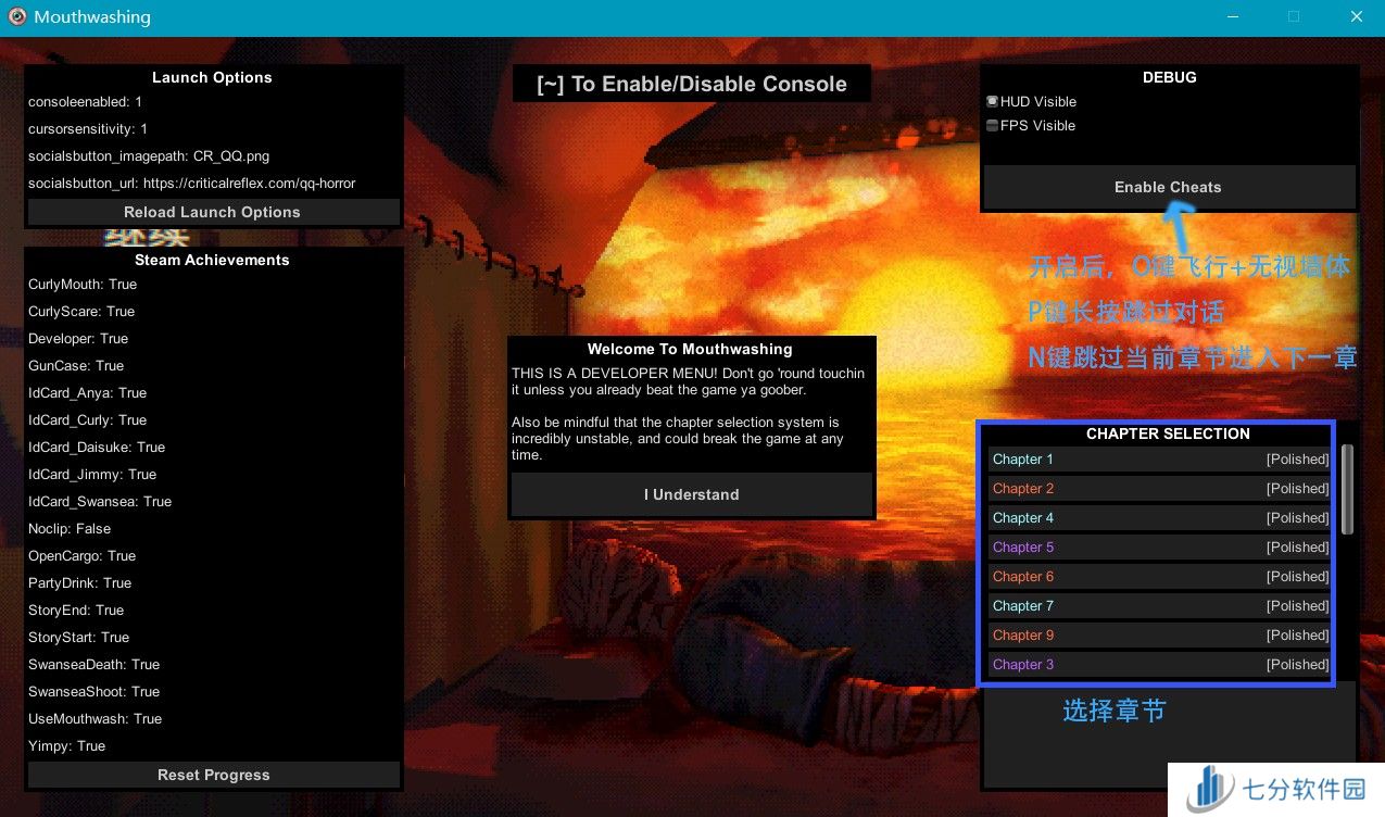 点击右上角的 "Enable Cheats" 可以开启作弊,开启后O键飞行+无视墙体,P键长按跳过对话,N键跳过当前章节进入下一章