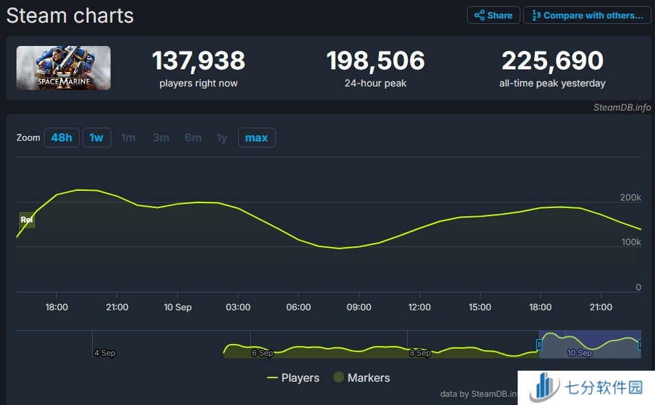 值得一提的是,《战锤40K:星际战士2》目前已售出200万份。据此前的SteamDB数据显示,《战锤40K:星际战士2》Steam玩家同时在线峰值为225690人,成为首发最成功的《战锤40K》游戏。