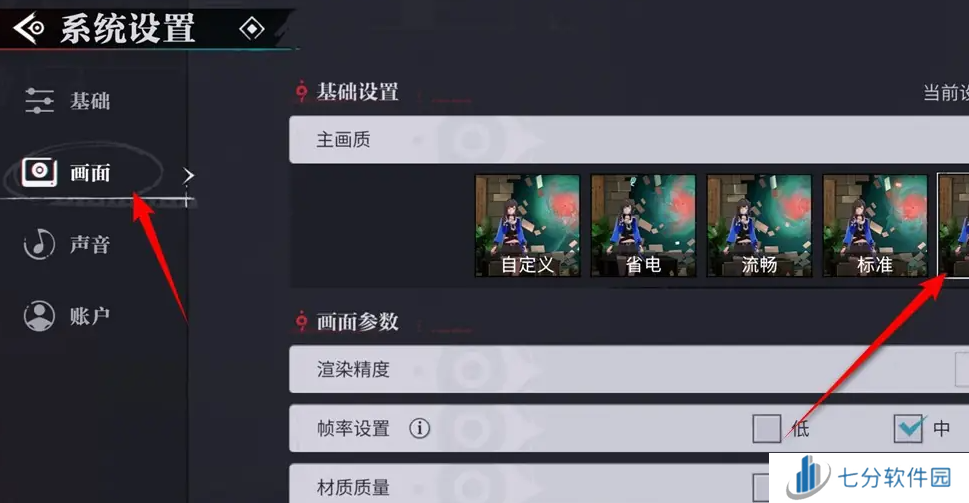 3、最后在该页面下点击画面,然后在展开的页面下勾选设画质即可
