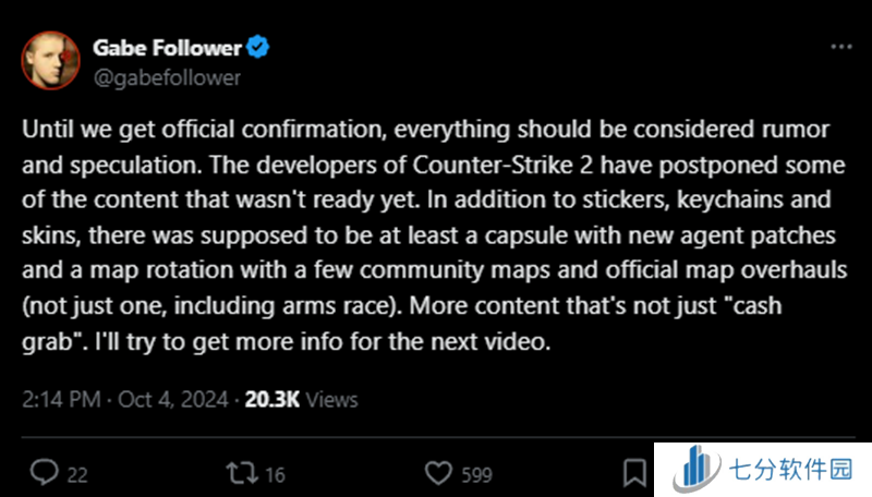 “在得到官方证实之前,一切都应被视为谣言和猜想。CS新版本的开发者推迟了一些尚未准备好的内容。除了贴纸、钥匙扣和皮肤外,本应至少有新的探员布章和由社区提供的几张新地图的轮换,包括对官方地图的更改 (不止是一张,包括军备竞赛)。还有更多的内容,而不仅仅是‘抢钱’。我会试着获取更多信息。”