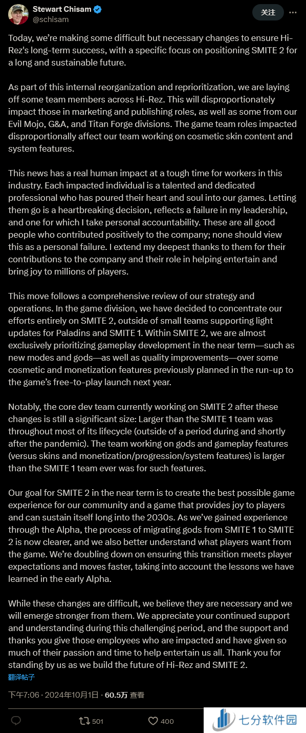公司首席执行官 Stewart Chisam 在社交媒体上写道,裁员是在“Hi-Rez范围内”进行的,但“将对营销和发行部门人员以及我们 Evil Mojo、G&A和 Titan Forge 部门的一些人员产生各种程度的影响。游戏团队的角色受到影响对我们致力于外观皮肤内容和系统功能的团队产生了各种程度的影响。”