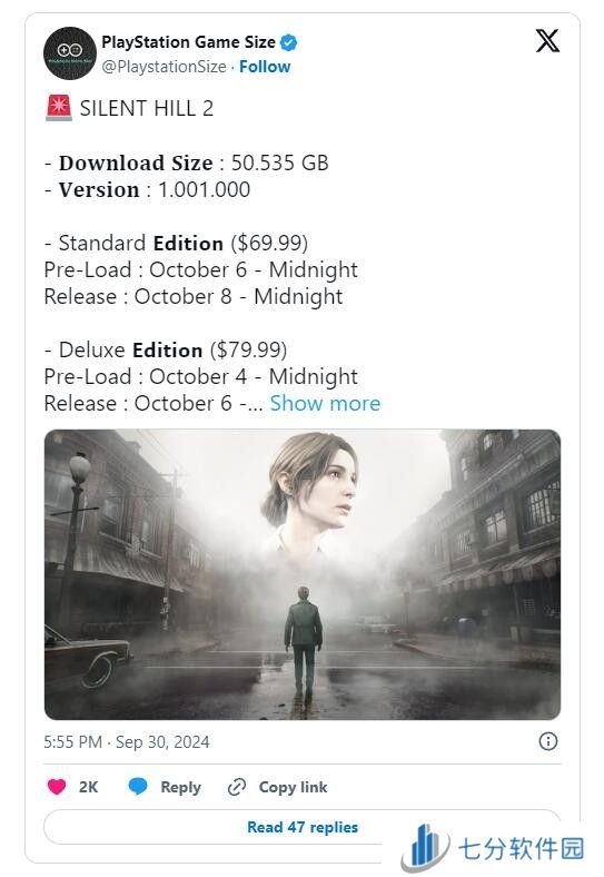 根据 @PlaystationSize(一个跟踪 PlayStation 商店后台的推特账号)的说法,《寂静岭2:重制版》的下载大小将略高于 50 GB,准确地说,是 50.535 GB,这与玩家对此类游戏的预期大小差不多。作为对比,去年的《生化危机4:重制版》的下载量超过了 58 GB。