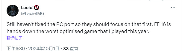 也有玩家表示,SE你们还是先考虑修一修你那优化稀烂的PC版吧,《最终幻想16》PC版是其今年玩过的优化最差的游戏。