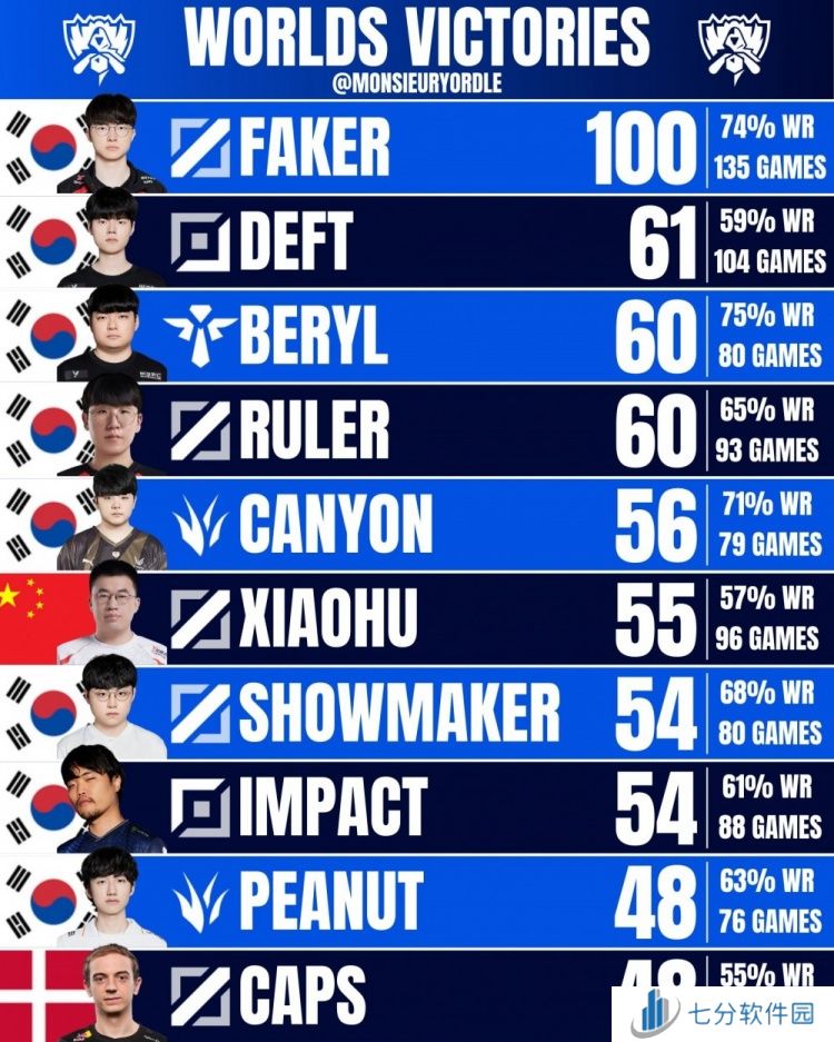 世界赛胜场数排名TOP10选手如下,Faker断层第一,Deft第二,BeryL第三,Ruler第四,Canyon第五,Xiaohu第六。