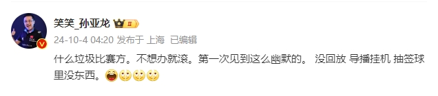 前职业选手孙亚龙更是怒喷比赛方:“什么*比赛方。不想办就滚。第一次见到这么幽默的。 没回放 导播挂机 抽签球里没东西。”
