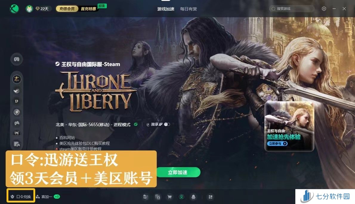 专属福利来了,输入口令【迅游送王权】,即可领取steam美区账号+3天会员时长,助你王权新服开荒一臂之力。
