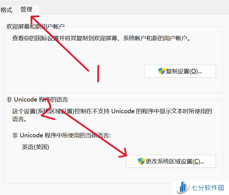 然后点击上面的管理。再点击更改系统区域设置,更改地区为美区