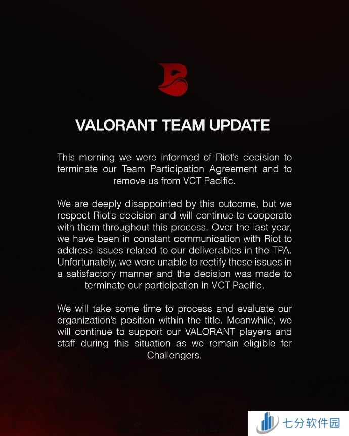 我们被告知拳头公司决定终止与我们俱乐部的参赛协议,并将我们从VCT Pacific中移除,我们对这个结果感到非常失望,但我们尊重拳头公司的决定。