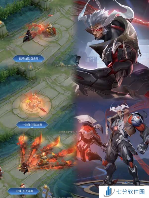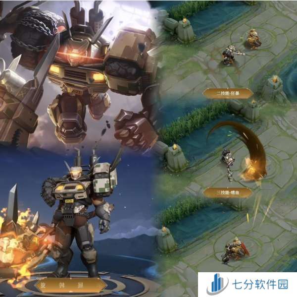这款皮肤和典韦的还挺像,同样是六元秒杀的勇者品质,偏向机甲风,特效一个土黄色一个橙红色,都是饱和度较高的颜色。
