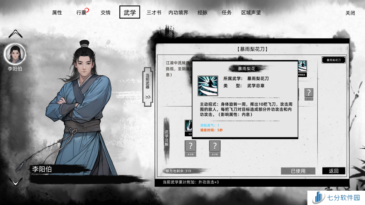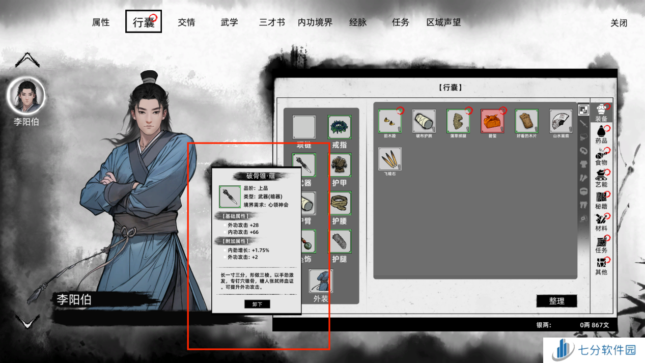 在游戏初期,可将初始属性分配给身法、悟性和内息,因为在离开青萍村之前,属性要求不会过于严格。完成青萍村的突破任务后,再考虑分配武力和筋骨等属性。