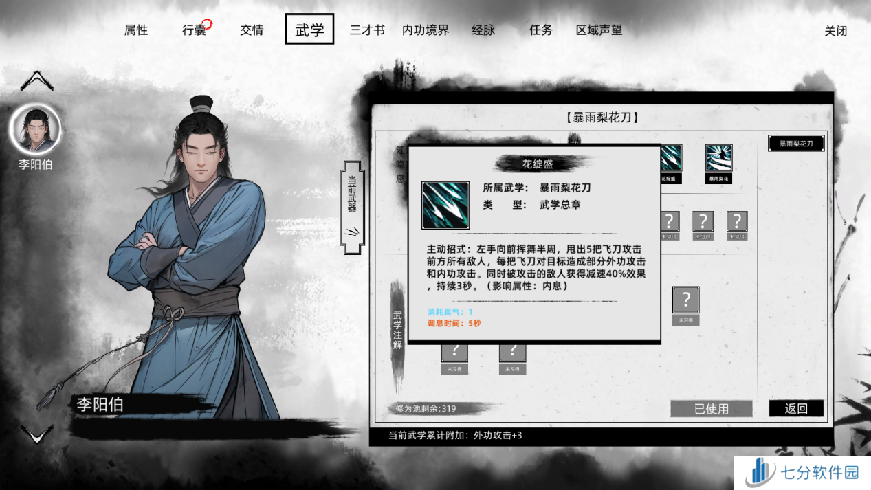 暴雨梨花:消耗1点真气,释放一个以玩家为中心的圆形aoe