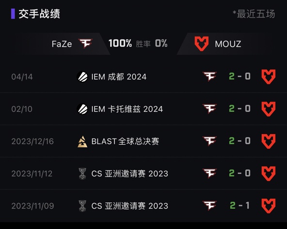FaZe又一次在IEM里约小组赛生死战中相遇,在此之前,FaZe保持着在CS新版本中对MOUZ的全胜记录,长达7连胜,并在16张地图中拿下14次胜利。