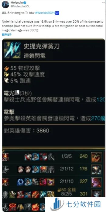 直播吧10月4日讯 S14瑞士轮TES击败T1,赛后解说Molecule发文:JackeyLove在对阵T1的比赛里使用了烬,其中值得注意的是他一共打出了16.5k的伤害(16489),单单电刀打出的伤害就有3860,这一数据在他打出的总伤害里占比超过了20%(23.4%)