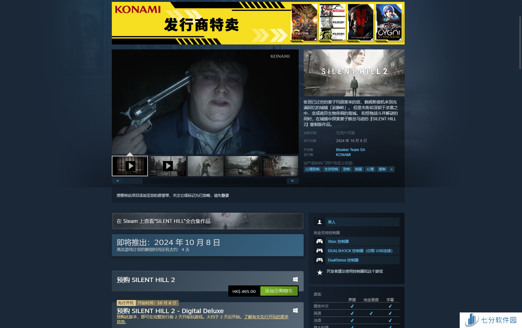《寂静岭2:重制版》Steam版的上线时间为2024 年 10 月 8 日上午10点左右,预载时间大概是前一天,也就是10月7日。
