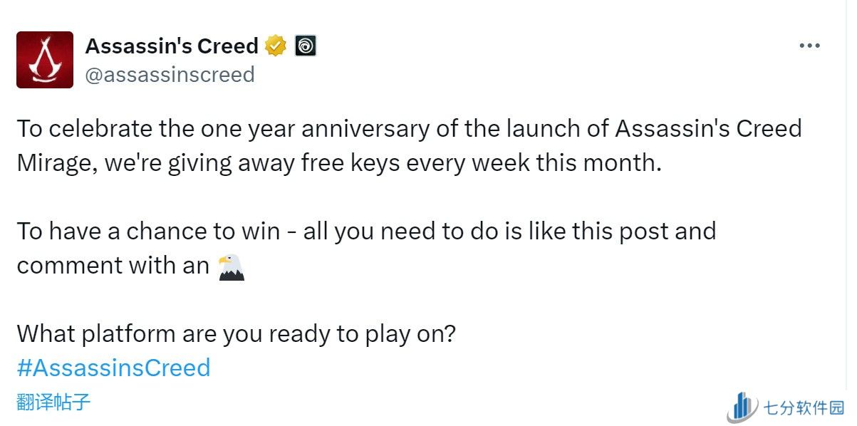 为庆祝《刺客信条:幻景》发售一周年,《刺客信条》官推从这个月开始每周发放激活码。玩家只需要点赞官方推文并且使用老鹰符号进行评论就可以。