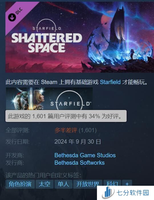 值得一提的是,《星空》DLC在steam平台的评分为“褒贬不一”,好评率34%。评论区除了对bug的吐槽外, 大部分差评玩家都认为扩展包不值得这个价(国区116元)。