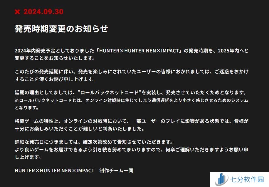 9月30日。《全职猎人》IP格斗游戏《全职猎人NEN×IMPACT》宣布跳票至2025年,新发售日期将在稍后公布,官方给出的延期理由是为了实现“回归网络代码”功能。《全职猎人NEN×IMPACT》原定于2024年推出,登陆PS5、Switch和Steam。