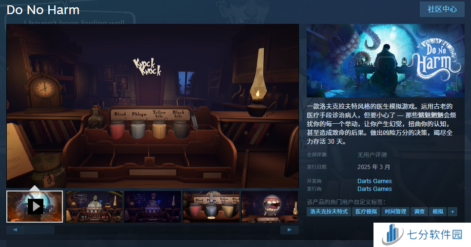 《Do No Harm》是一款洛夫克拉夫特风格的医生模拟游戏。运用古老的医疗手段诊治病人,但要小心了 — 那些魑魅魍魉会烦扰你的每一个举动,让你产生幻觉,扭曲你的认知,甚至造成致命的后果。做出凶险万分的决策,竭尽全力存活30天。