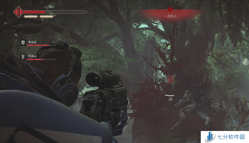 推荐用追猎者爆矢步枪,备弹多,能连发,大型敌人可以先近战打出处决再用枪爆头,可以通过准心来判断是否爆头,如图