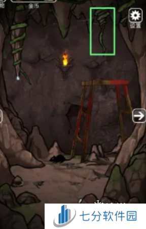 3、进入到山洞中点击墙上的火把框,将火把放上去,点击挪开地上石头。