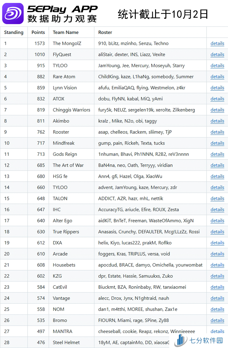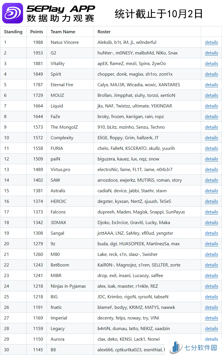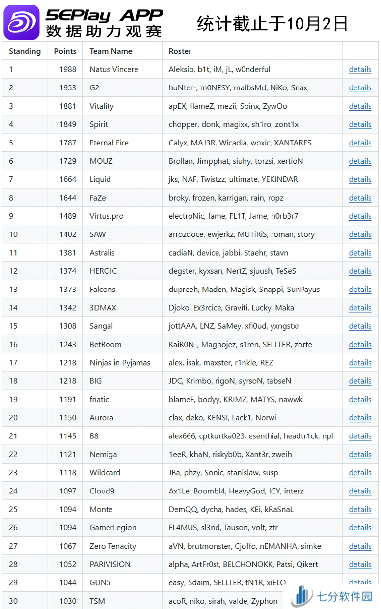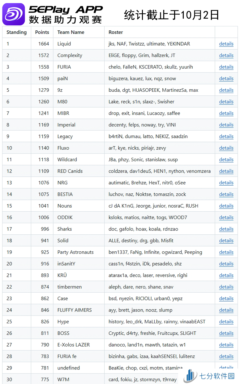 欧洲区Top30战队如下: