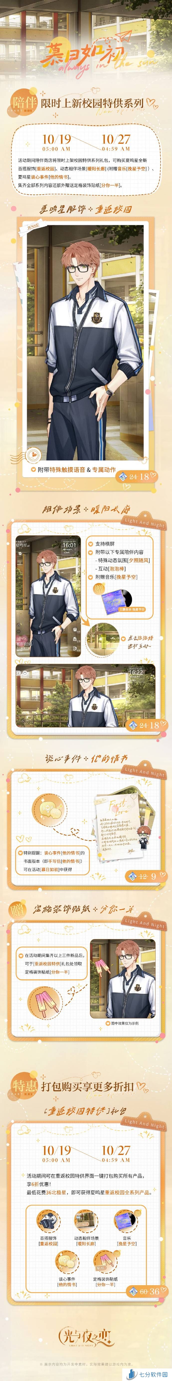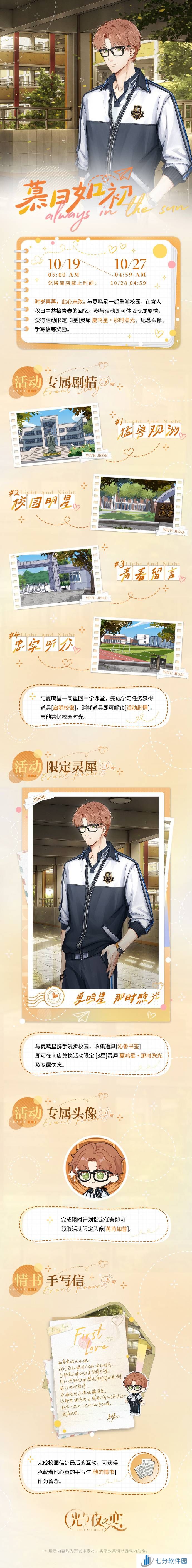 活动说明:时岁苒苒,此心未改。与夏鸣星一起重游校园,在宜人秋日**拾青春的回忆。参与活动即可体验专属剧情,获得活动限定 [3星]灵犀 夏鸣星・那时煦光、纪念头像、手写信等奖励。