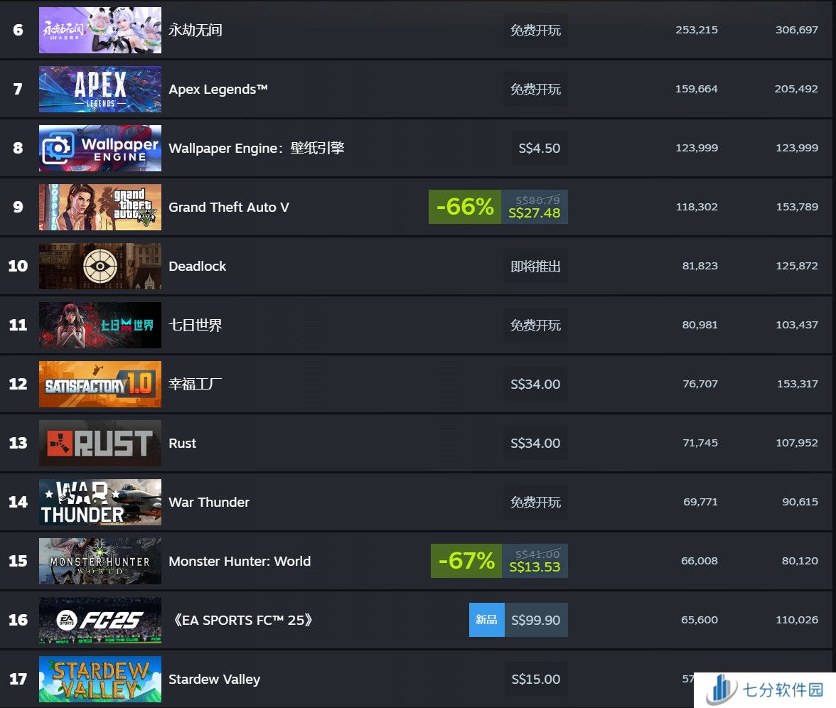 《怪物猎人:世界》Steam当前在线人数已经超过了新作《EA Sports FC 25》,位列Steam最热游戏榜第15名