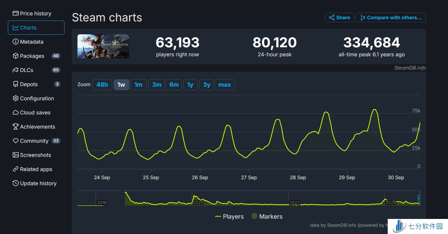 根据SteamDB统计,《怪物猎人:世界》Steam在线24小时峰值超过了8万,当前在线6.3万。随着国庆假期的到来,《怪物猎人:世界》Steam同时在线还会继续升高。