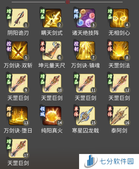●代表:包括常见的群伤类(三绝、疾风)、控制类(天罡、炽元、覆雨)等。