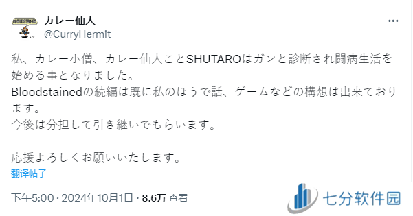 游戏开发者饭田周太郎昨天(10月1日)在社交网站X上宣布,自己罹患癌症,将开始治疗生活,目前已经移交游戏开发的工作。