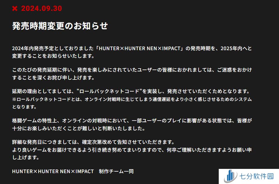 Bushiroad宣布对战格斗游戏《全职猎人:NEN×Impact》将于原定的2024年内推出延期至2025年推出,原因是为追加回滚网络代码。