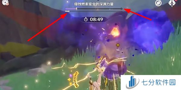 6、下方白条为护盾,需将其打破方可触及上方深渊力量,当深渊力量被全部消耗后方可捕捉虫子。
