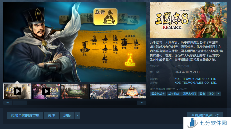 《三国志8重制版》是一款三国题材策略模拟游戏,而这款游戏的官网地址就是Steam平台、PS平台和switch平台的购买页面,进入到这个游戏的购买页面基本上就能知道所有这款游戏的信息。
