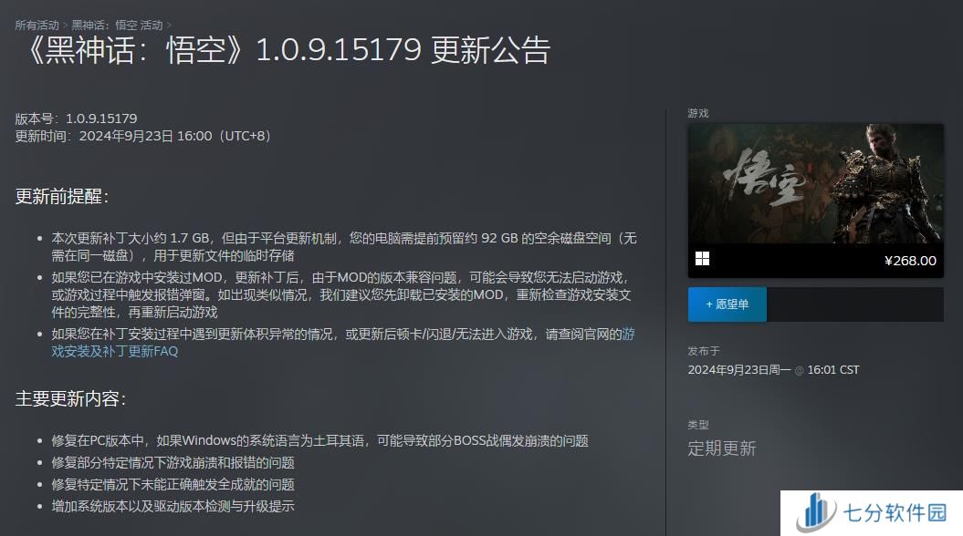 本次更新补丁大小约 1.7 GB,但由于平台更新机制,您的电脑需提前预留约 92 GB 的空余磁盘空间(无需在同一磁盘),用于更新文件的临时存储