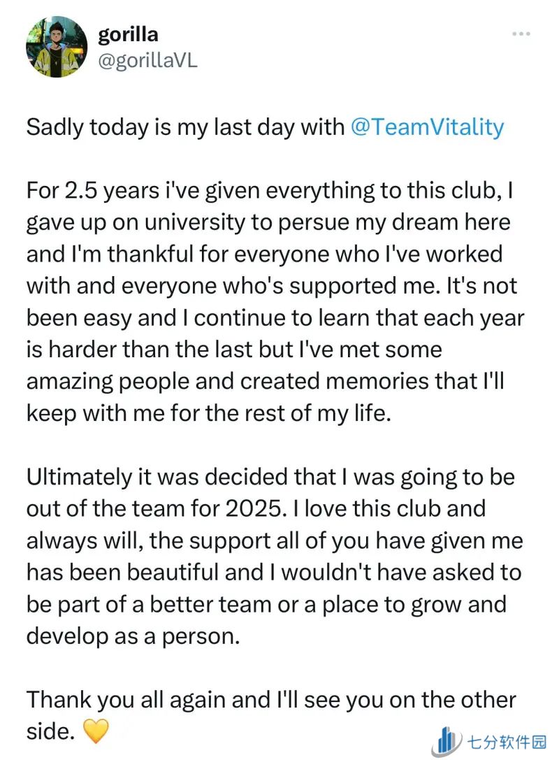 近日,VCT EMEA联赛的VIT战队主教练gorilla发文告别队伍:两年半以来,我为VIT俱乐部付出了一切,我放弃了大学,在这里追寻我的梦想,我感谢所有与我共事以及支持我的人。经过慎重的考虑,我决定在这个赛季离队,我热爱VIT这个俱乐部,在这里我获得了所有人无比美好的支持,再次感谢大家,我们以后再见。