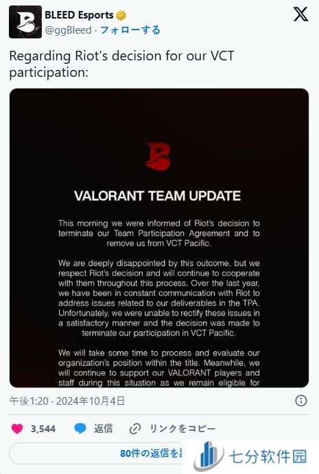 据报道称,这一举动是因为BLEED Esports未能履行团队参与协议(TPA)中规定的关键报告责任及其他主要职责,具体情况未作公开透露。在官网上,BLEED Esports表示他们于今天上午收到 Riot Games的解约通知,并正式退出联盟,在过去一年来,他们一直在努力解决TPA问题。