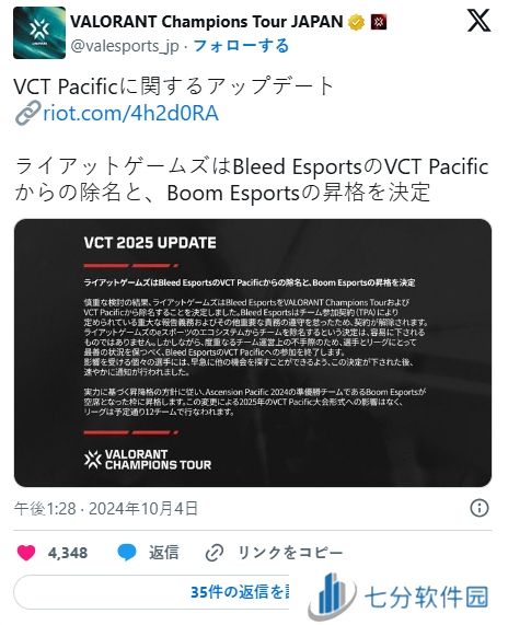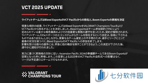 今日(2024年10月4日), Riot Games宣布撤销电竞战队BLEED在其战略FPS游戏《无畏契约(VALORANT)》(PC/PS5/Xbox Series X|S)官方锦标赛“VALORANT Champions Tour”中的参赛资格,同时加入新成立的竞技战队BOOM Esports。