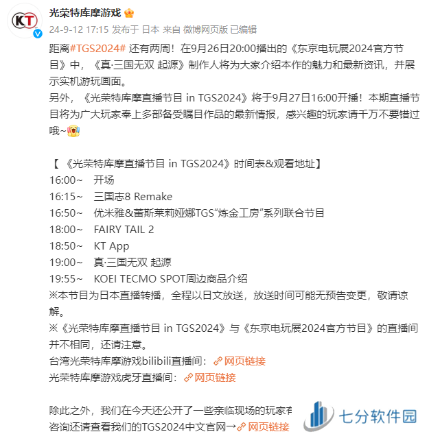 值得注意的是,《光荣特库摩直播节目 in TGS2024》的直播环境与《东京电玩展2024官方节目》的直播间是相互独立的,请观众朋友们留意区分,以免错过任何一场精彩直播。