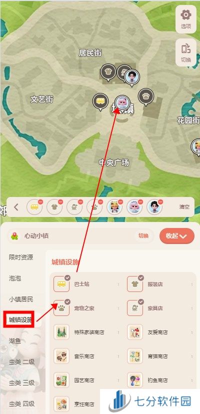 2、选择城镇设施,然后会有巴士站、服装店、家具店这些地图信息,勾选以后就会相对应的在地图上显示出位置来。